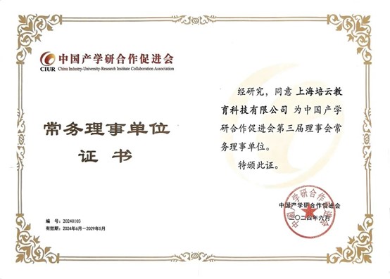 鉴于培云科技前期与各高校开展的产学研合作模式与途径探索,及取得的创新成果,经中国产学研合作促进会考察评估,特吸纳我司为该会常务理事单位,我司执行经理夏天为该会常务理事,有效期均为5年。