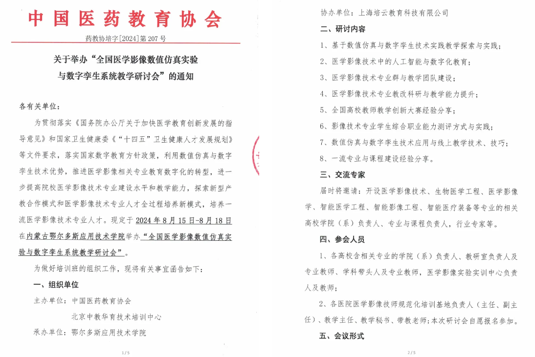 药教协培字207号--全国医学影像数值仿真实验与数字孪生系统教学研讨会