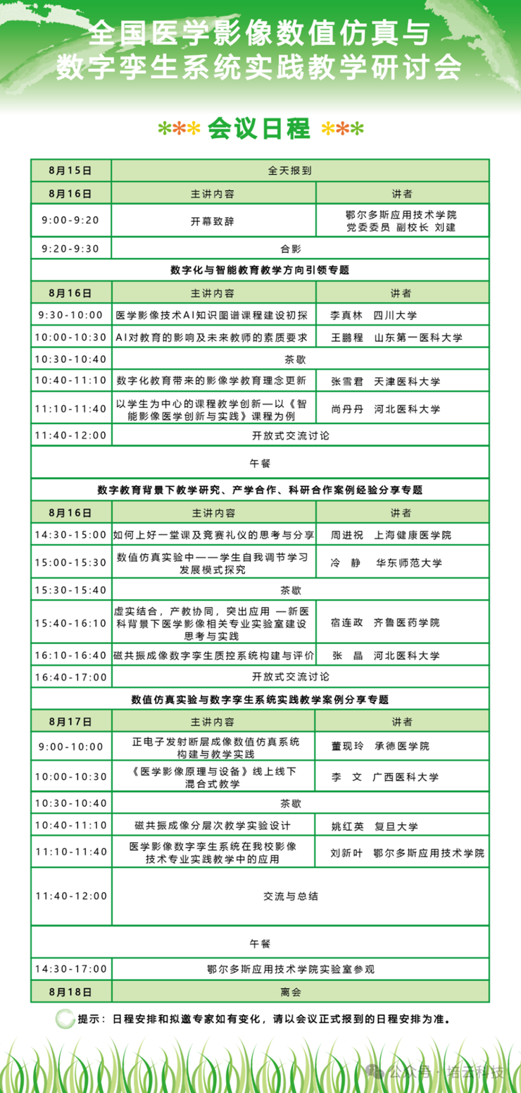 为贯彻落实《国务院办公厅关于加快医学教育创新发展的指导意见》和国家卫生健康委《“十四五”卫生健康人才发展规划》等文件要求,落实国家数字教育方针政策,利用数值仿真与数字孪生技术优势,推进医学影像相关专业教育数字化的转型,进一步提高院校医学影像相关专业建设水平和教学能力,探索新型产教合作模式和医学影像相关专业人才全过程培养新模式,培养一流医学影像相关专业人才。现定于2024年8月15日-8月18日在内蒙古鄂尔多斯市举办“全国医学影像数值仿真实验与数字孪生系统教学研讨会”。欢迎各位专家和老师们莅临指导!