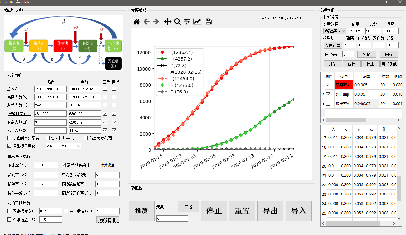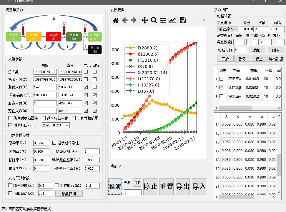 Ø 感染率(λ):每个携带者或染病者日均感染人数;可用R0/平均潜伏天数来设置。根据初期R0=3,平均潜伏天数为3(见潜伏人数设置中),可填入参数1。【该参数可使用扫描功能选定一个最优值】